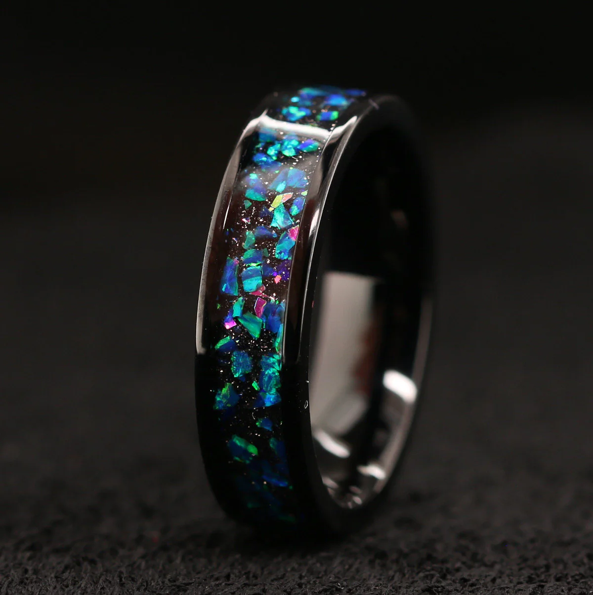DeepĀ Blue,Ā Green,Ā andĀ PurpleĀ opal chips inlayed in a 7mm wide surgical stainless steel wedding band, professionally plated with black IP plating.