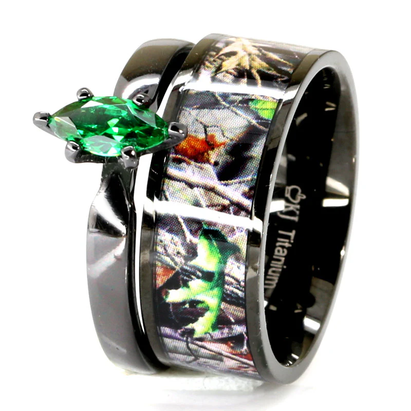 Crafted with precision, these rings feature a sleek black camouflage pattern that evokes the mysterious depths of the forest at night. The centerpiece, a striking green marquise gem, adds a touch of sophistication and luxury, making each ring not just a piece of jewelry but a statement of personal style and commitment.