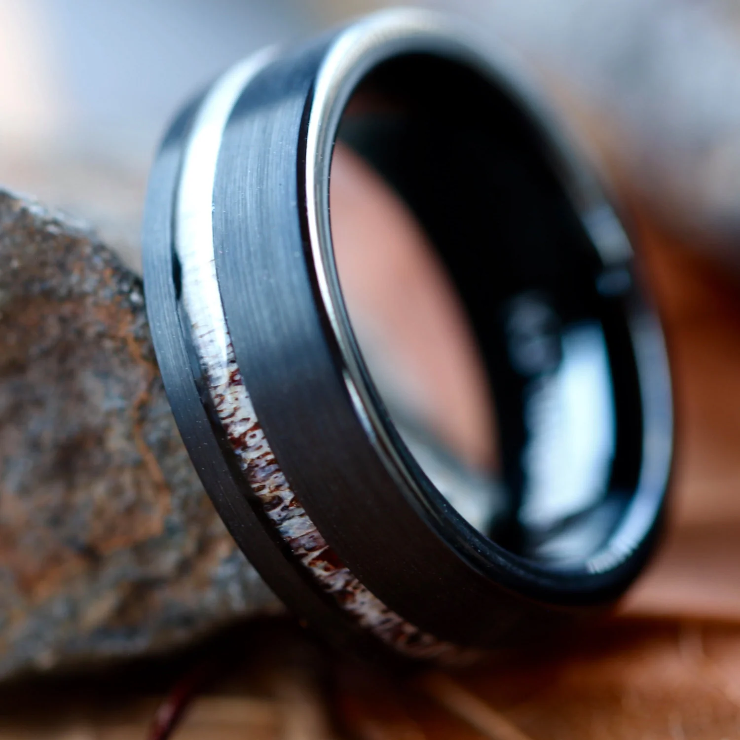 Black Tungsten Deer Antler Ring - Unisex Wedding Band Hunter Ring