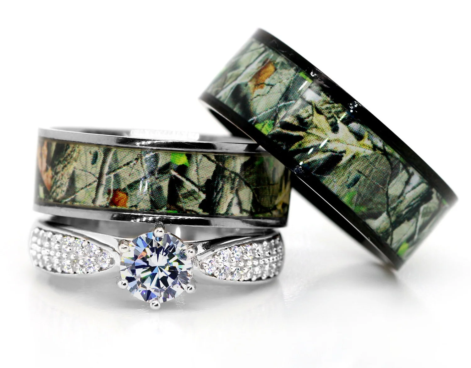His and Her Camo Wedding Ring Set Titanium and Sterling Silver Engagement Rings