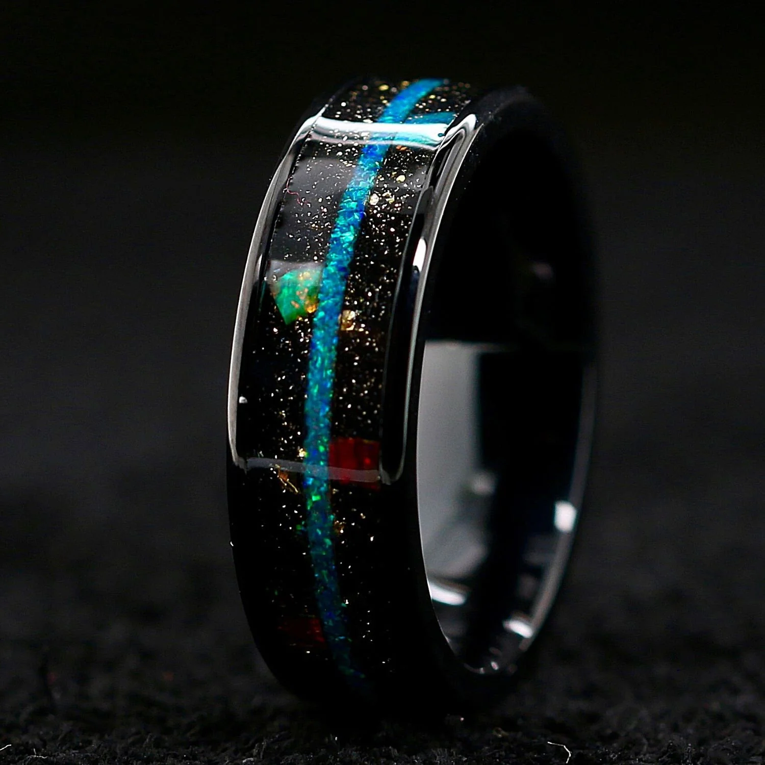 With a star studded inlay, this unique ring captures the look of the galaxy sprawled across the night sky, decorated with red, blue, and green opal chips.Ā
