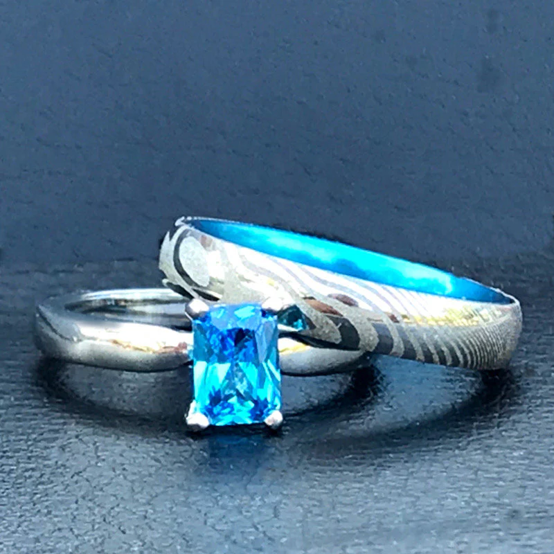 His and Her Blue Damascus Ring Set Damascus Steel Wedding Rings Set