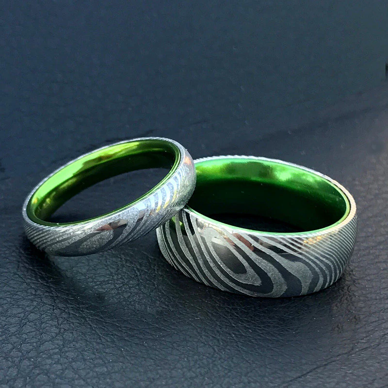 Damascus steel is an ancient art form that produces beautifully crafted rings. This handcrafted exquisite ring comes in a silver tone with a unique design - no two rings are the same! Hours and hours were put into this craft, all visible in each ring's design, layer after layer of alternating fine and surgical stainless steel were custom laid over one another to produce this fine work of jewelry. The inner band is made of Aluminum and plated green plating and can be engraved with a personal message, name, or date.