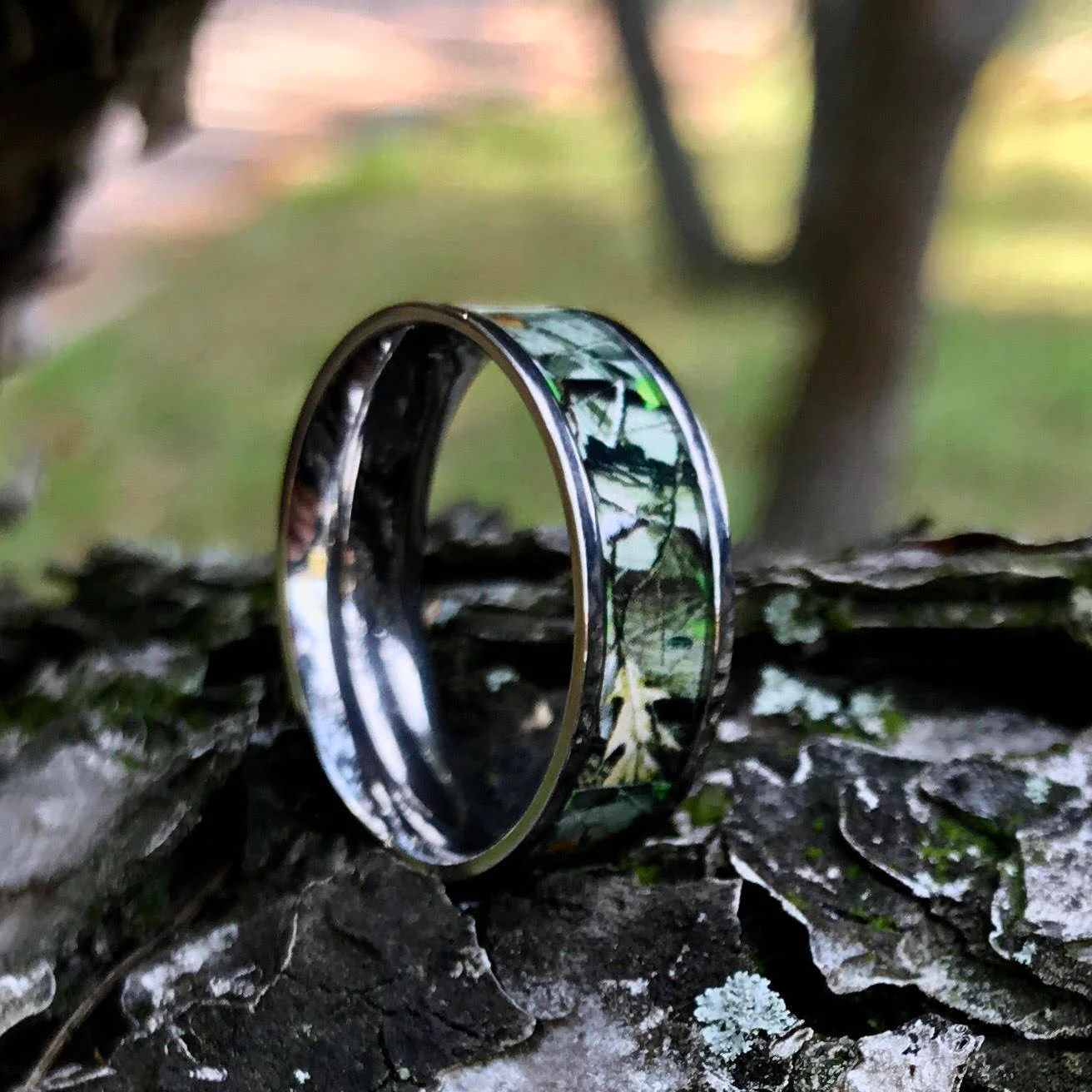 This Titanium camo ring is the ultimate hunters gift. Decorated by an Oak CAMO design and protection resin layer, its physical qualitiesĀ include high strength-to-weight ratio, toughness, durability, low density, corrosion resistance and biological compatibility (allergy free)